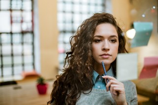 A person contemplates while holding a pen near their chin, looking at sticky notes on a glass wall in a brightly lit office setting.